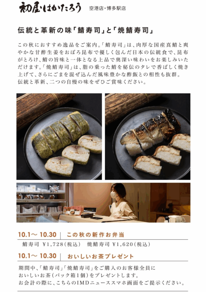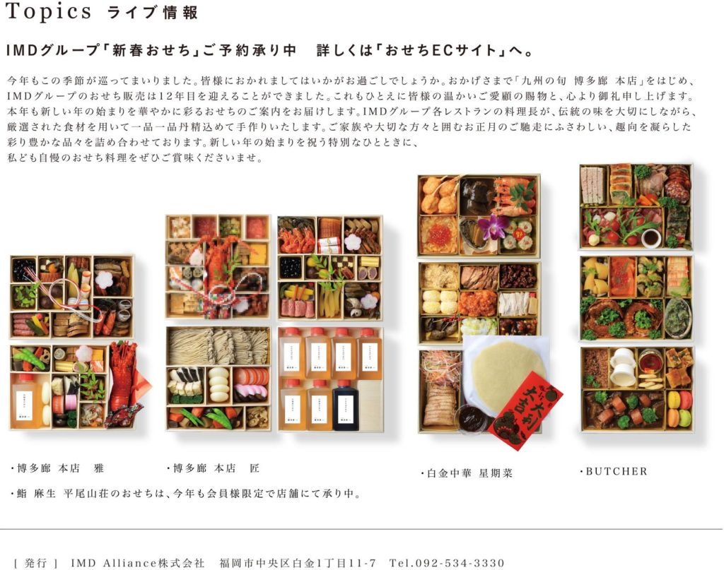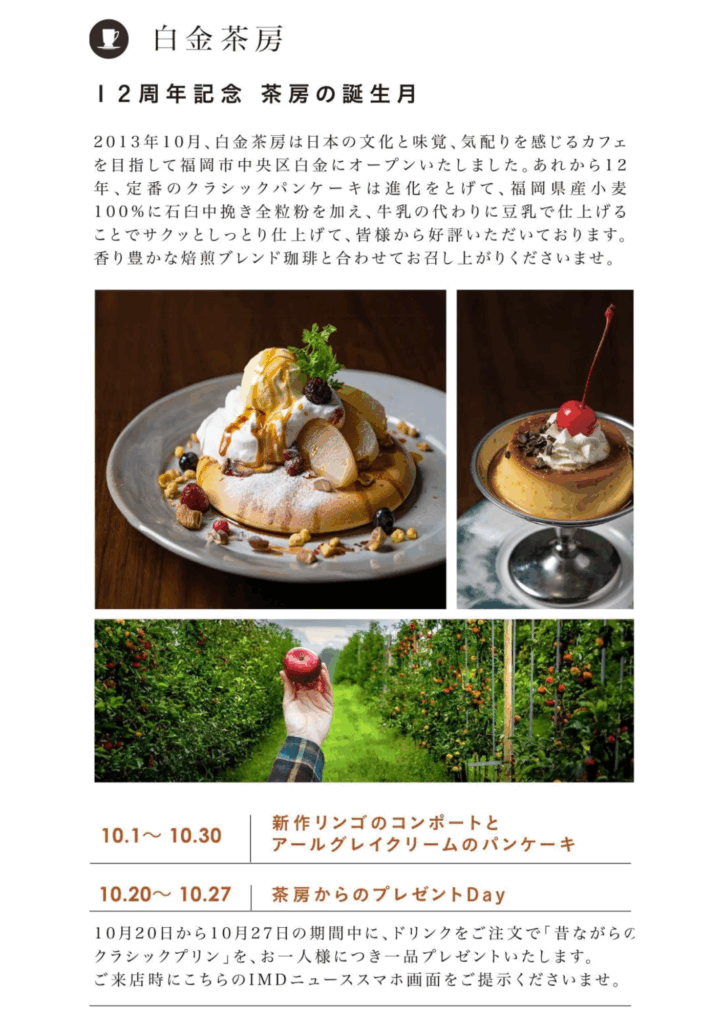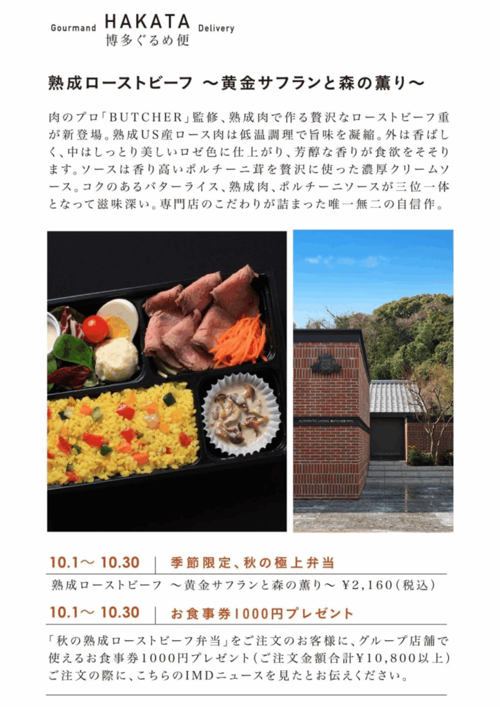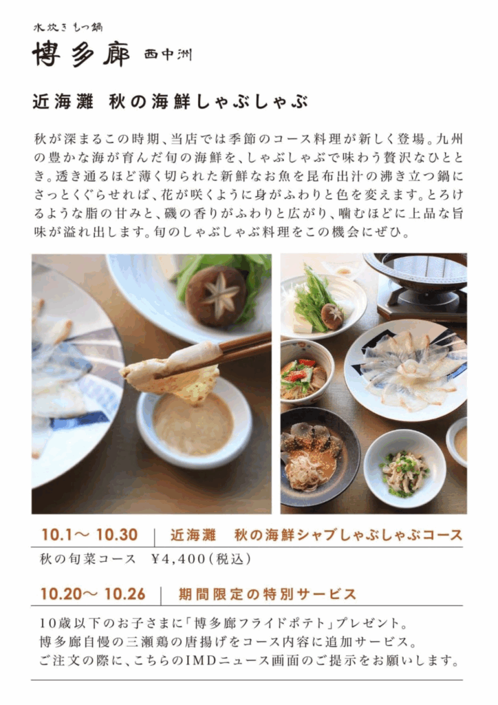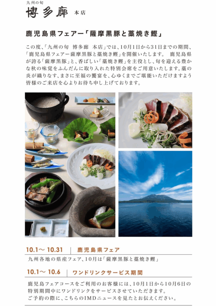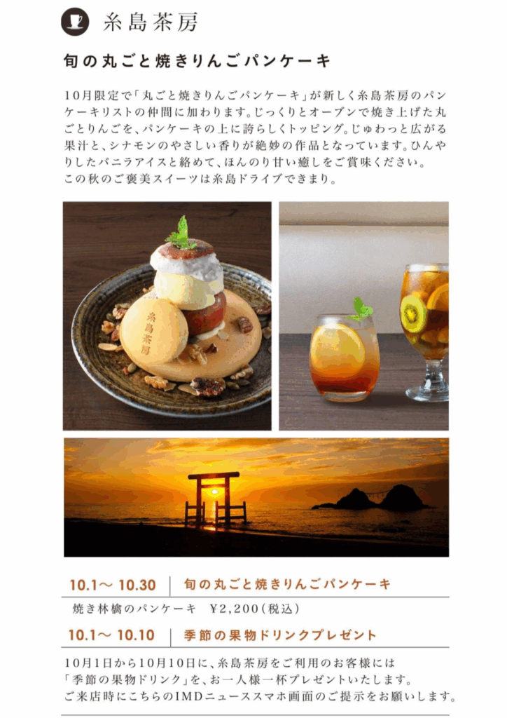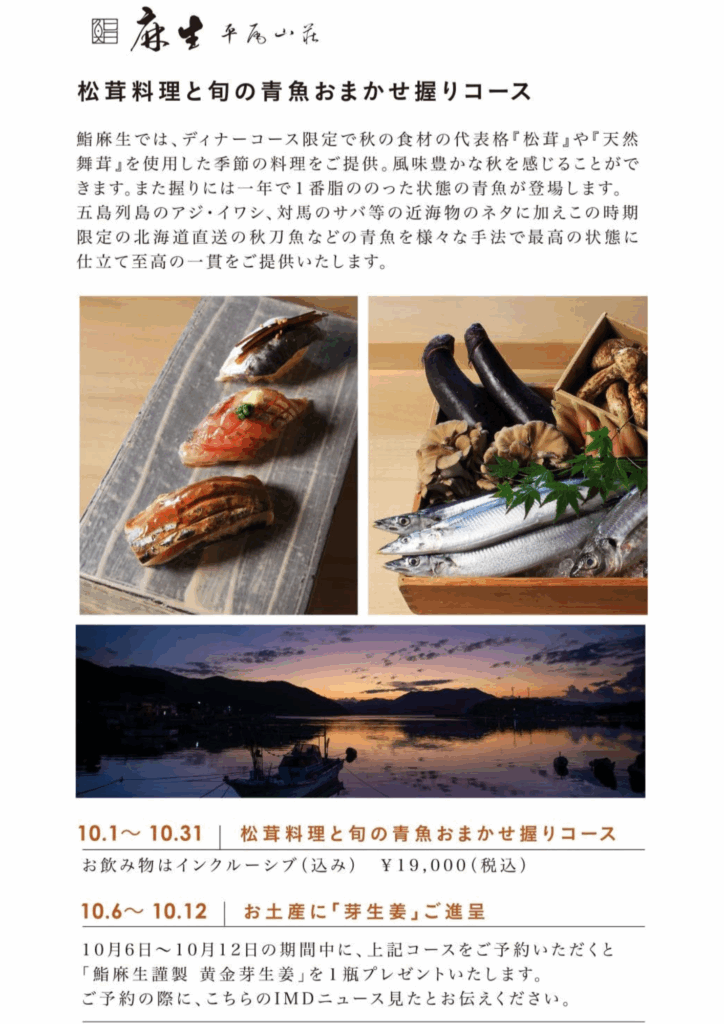 IMD NEWS 10月号 イベントのお知らせ 2025年9月22日 最終更新日時 : 2025年9月22日 ms5@imd-a.jp 10月1日より、全店舗にて『収穫の秋、食と美の風景』をテーマとしたイベントを開催いたします。 各店舗が厳選した食材を使い、この時期ならではの特別なお食事をご用意して、皆様のご来店を心よりお待ちしております。 詳細は下記より各店舗の公式サイトをご覧ください。