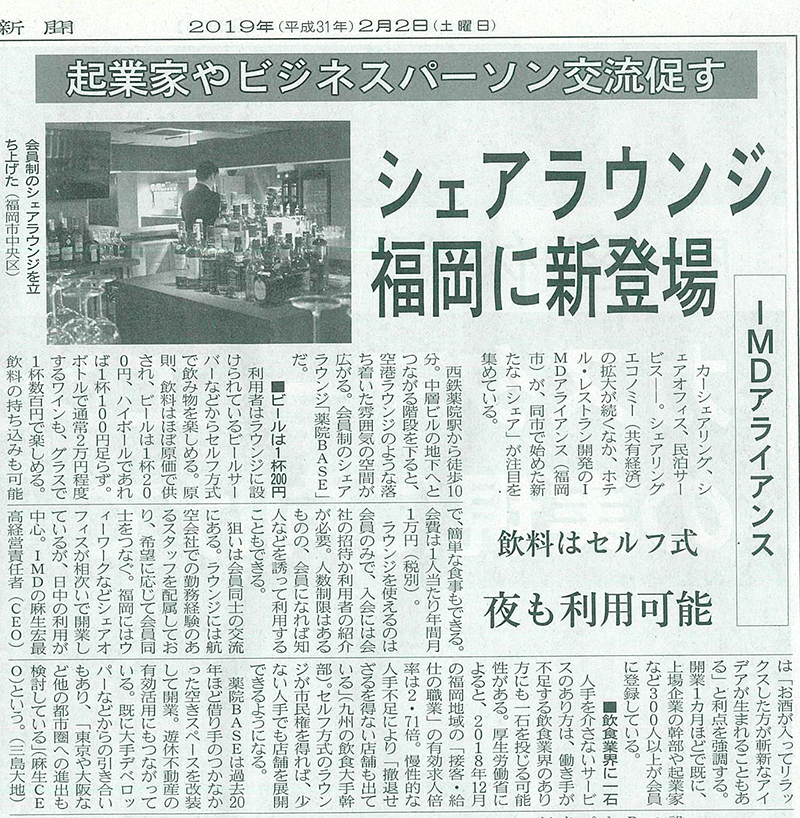 日経新聞掲載 : シェアラウンジ福岡に新登場